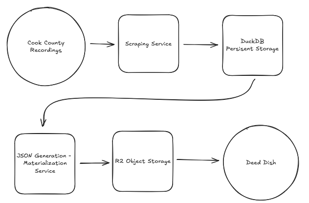 The materialization pipeline is a Python service that generates documents for parcels and owners. Parcel-level documents contain the deed history for a given parcel, and owner-level documents contain a list of all parcel IDs with the owner in the deed history. Each document is stored as a single JSON file, with the final step of the pipeline transferring the document to a Cloudflare R2 bucket.